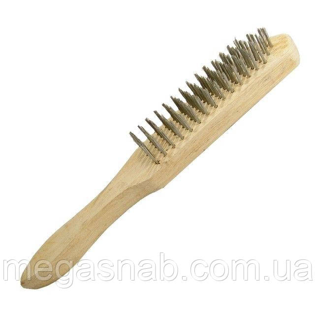 Щітка ручна 4-рядна з дерев'яним корпусом ТМ INTERTOOL BT-0002 призначена для грубої зачистки поверхонь з металу. Матеріал щітки — сталевий дріт.